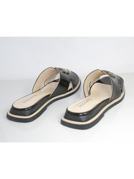 Eleganckie bardzo komfortowe klapki wykonano z naturalnej skóry licowej . Szeroki pasek butów ozdobiono złotą ozdobą ze skórzaną wstawką. Wkładkę w klapkach wykonano ze skóry naturalnej.