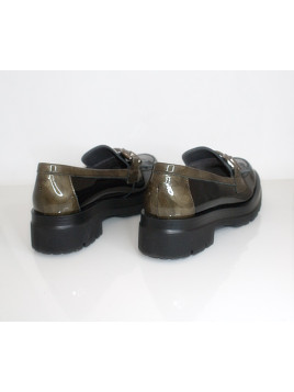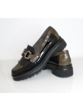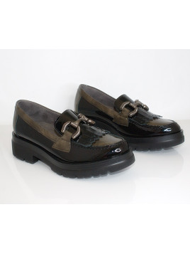 KOLOR : Czarny / oliwka MATERIAŁ ZEWNĘTRZNY : Skóra lakier WKŁADKA : Miekka OBCAS/ TYP/ WYSOKOŚĆ : 2cm TĘGOŚĆ : G